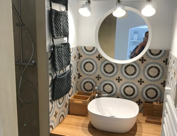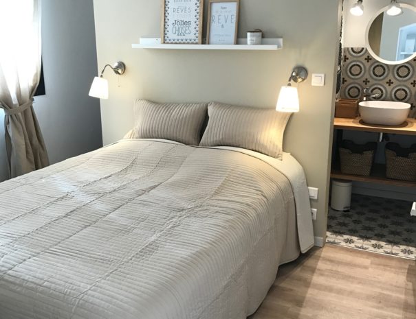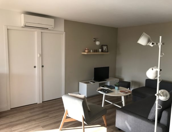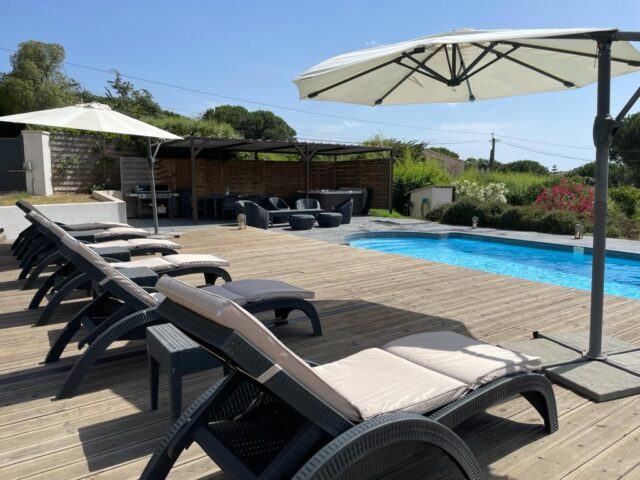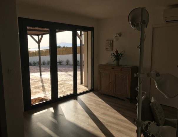 L’appartement donne sur une grande terrasse couverte d’une pergola puis sur la piscine de la villa entièrement sécurisée avec sa terrasse mobile et chauffée et enfin sur le jardin arboré avec son terrain de pétanque.