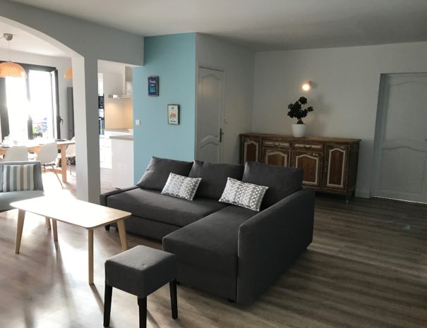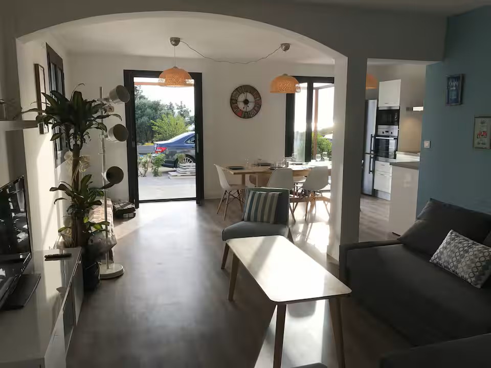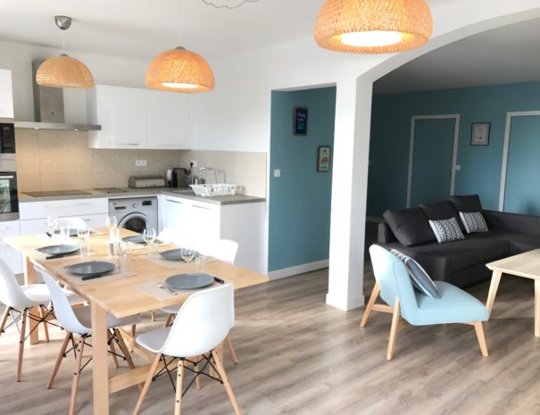 Intérieur fonctionnel, climatisé et agréable à vivre avec sa cuisine ouverte et entièrement équipée (Four, micro-ondes, plaques à induction, frigidaire et congélateur, machine à laver et lave-vaisselle et machine à café Nespresso) donnant sur un séjour spacieux avec canapé convertible, TV, table basse et buffet.